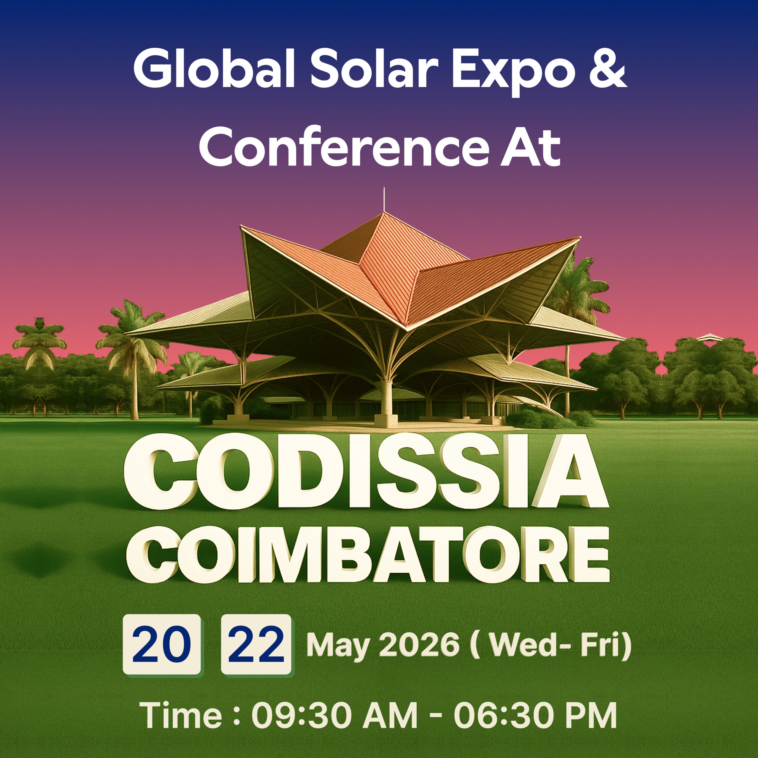 Global Solar Expo 2025 is coming to Coimbatore for its 2nd Edition, taking place at the prestigious Codissia Trade Fair Complex from 20–22 May 2025 (Tuesday–Thursday).