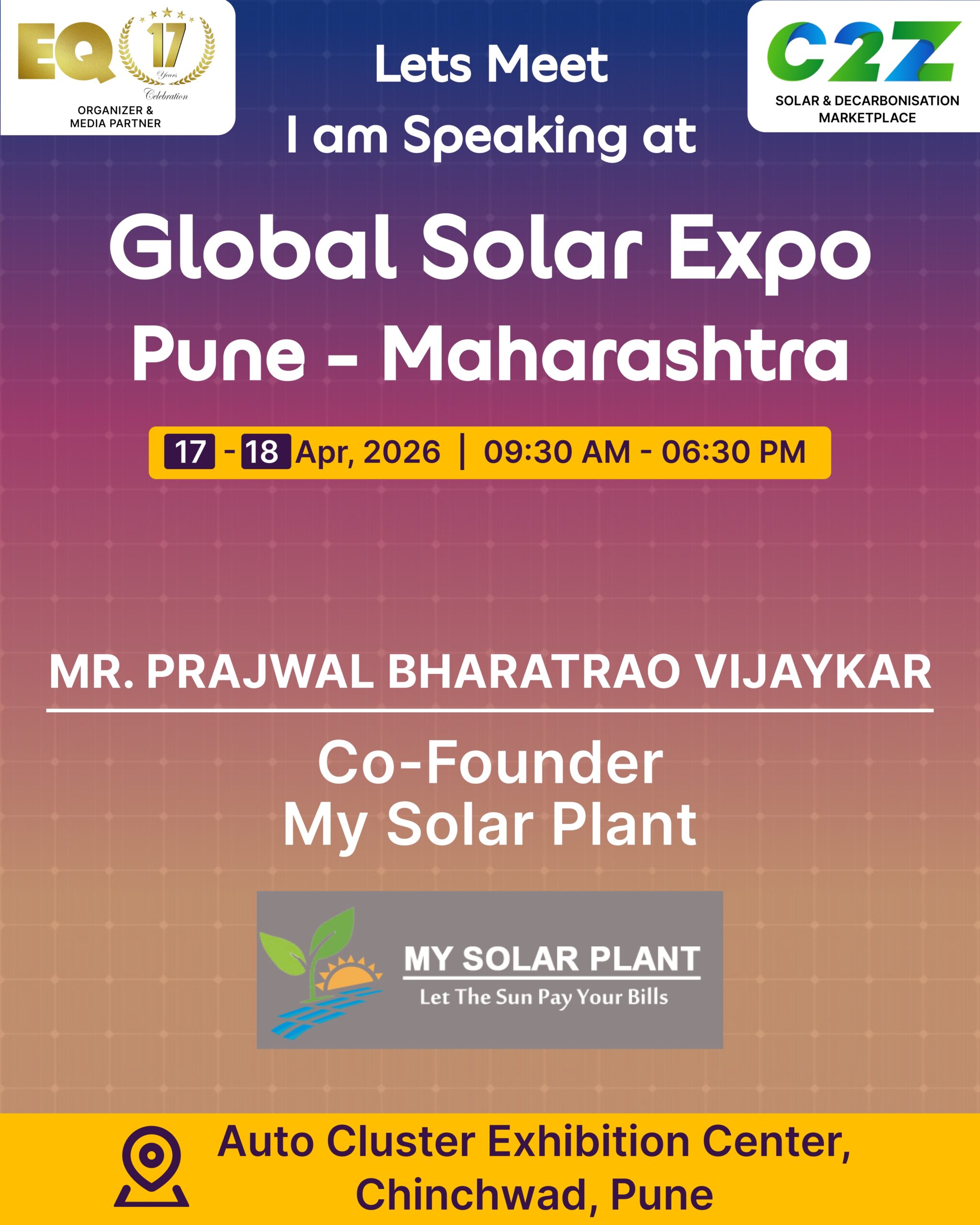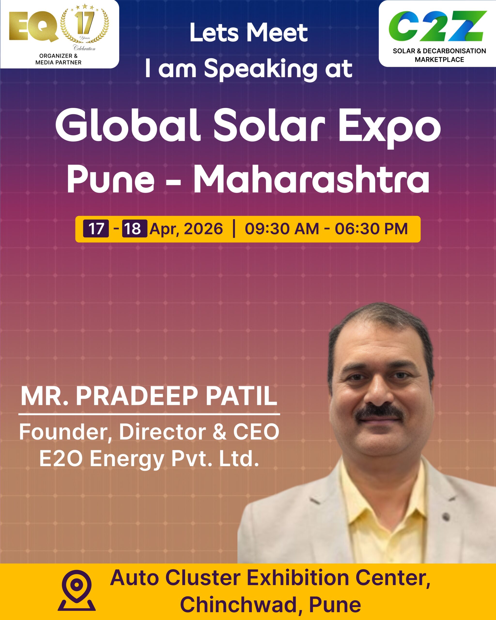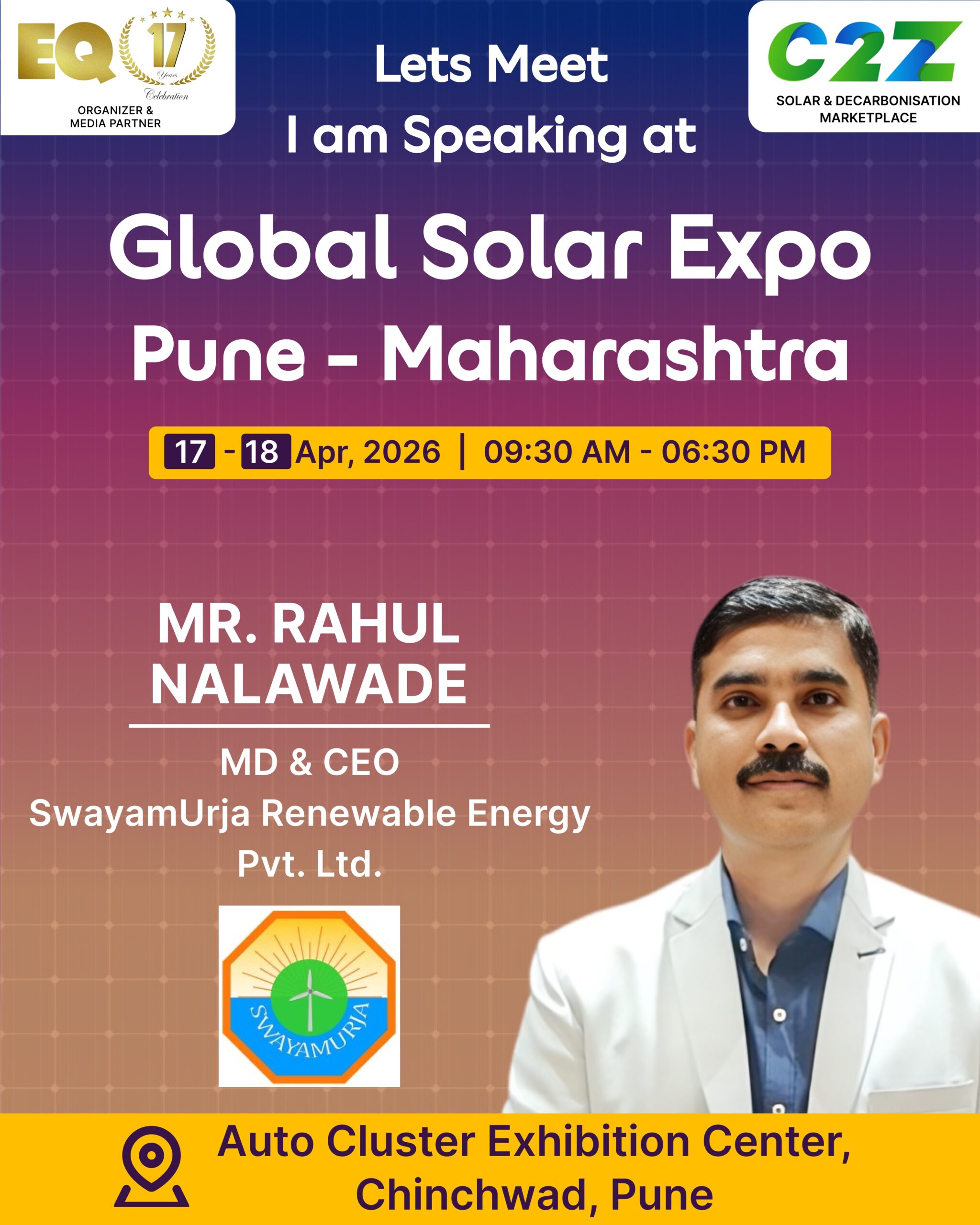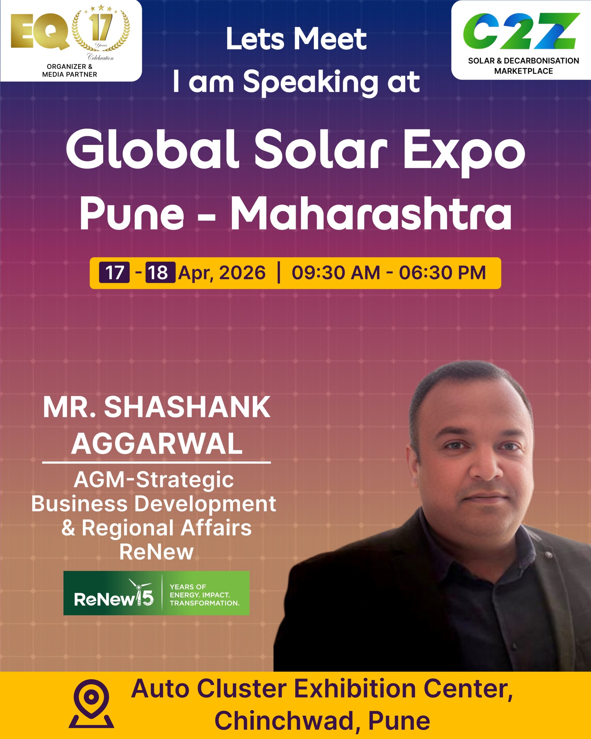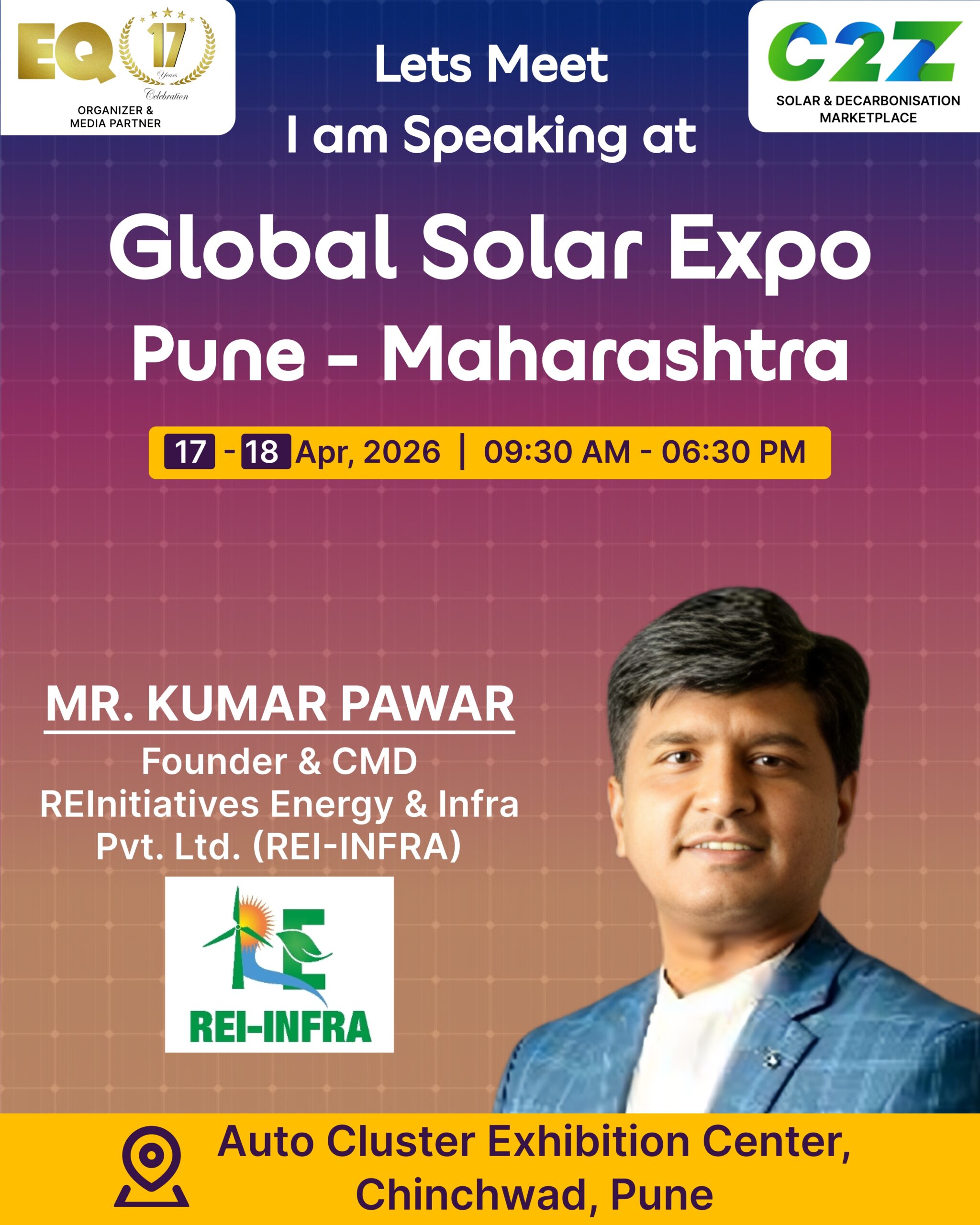 Organised by EQ International, the Pune edition is set to make a powerful mark at on 17–18 April 2026. This mega event will bring together the leading names in solar, renewable energy, sustainability, and clean technologies.